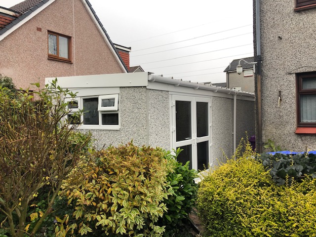 Recently completed in Kilbirnie Ayrshire, a garage to front half and garden room to rear. This is complete with side slope insulated roof, PVC french doors and windows.