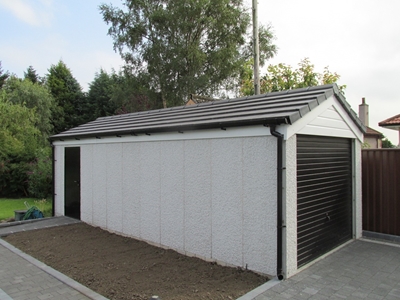 This project is a new garage in Giffnock. The site slopes quite a bit from front to back so rather than lay a concrete base slab we have built brickwork retaining walls around the perimeter on concrete strip foundations at a depth of about 60cm (2’0”) below ground level. The walls have been backfilled with compacted type 1 hardcore and we have laid out the damp-proof membrane. We have also laid out polythene to protect the driveway.